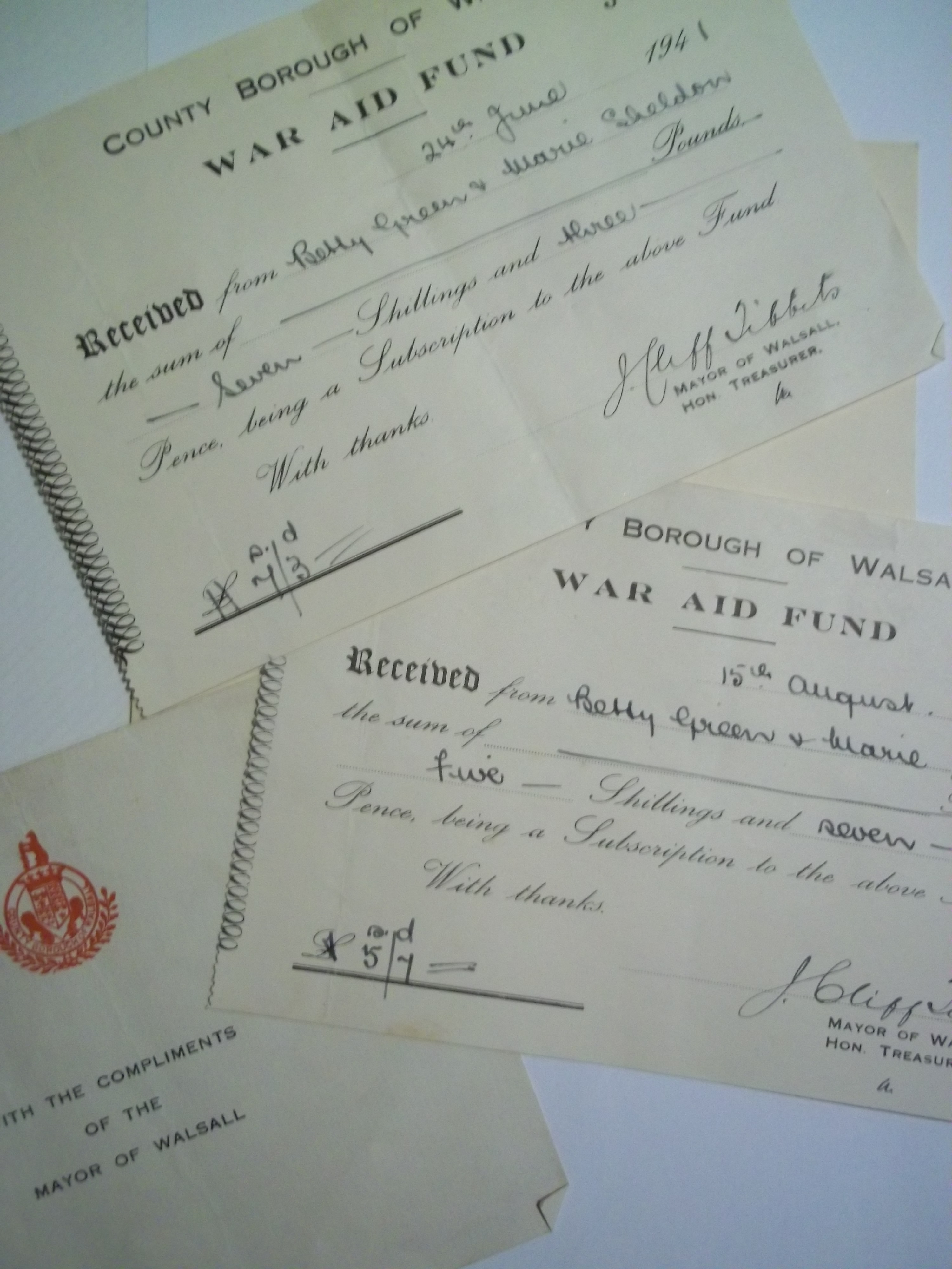 Mother and her best friend Betty Green took an early interest in the war effort. These receipts from the Mayor’s office in Walsall are for sums they raised together for the fighting fund and date to before her 12th birthday!