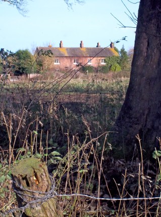 View across the site of the Bakewell/Hackett cottage in Orgreave to the upper windows of Orgreave Farmhouse, from which Mrs Barton watched Thomas Bond commit murder.