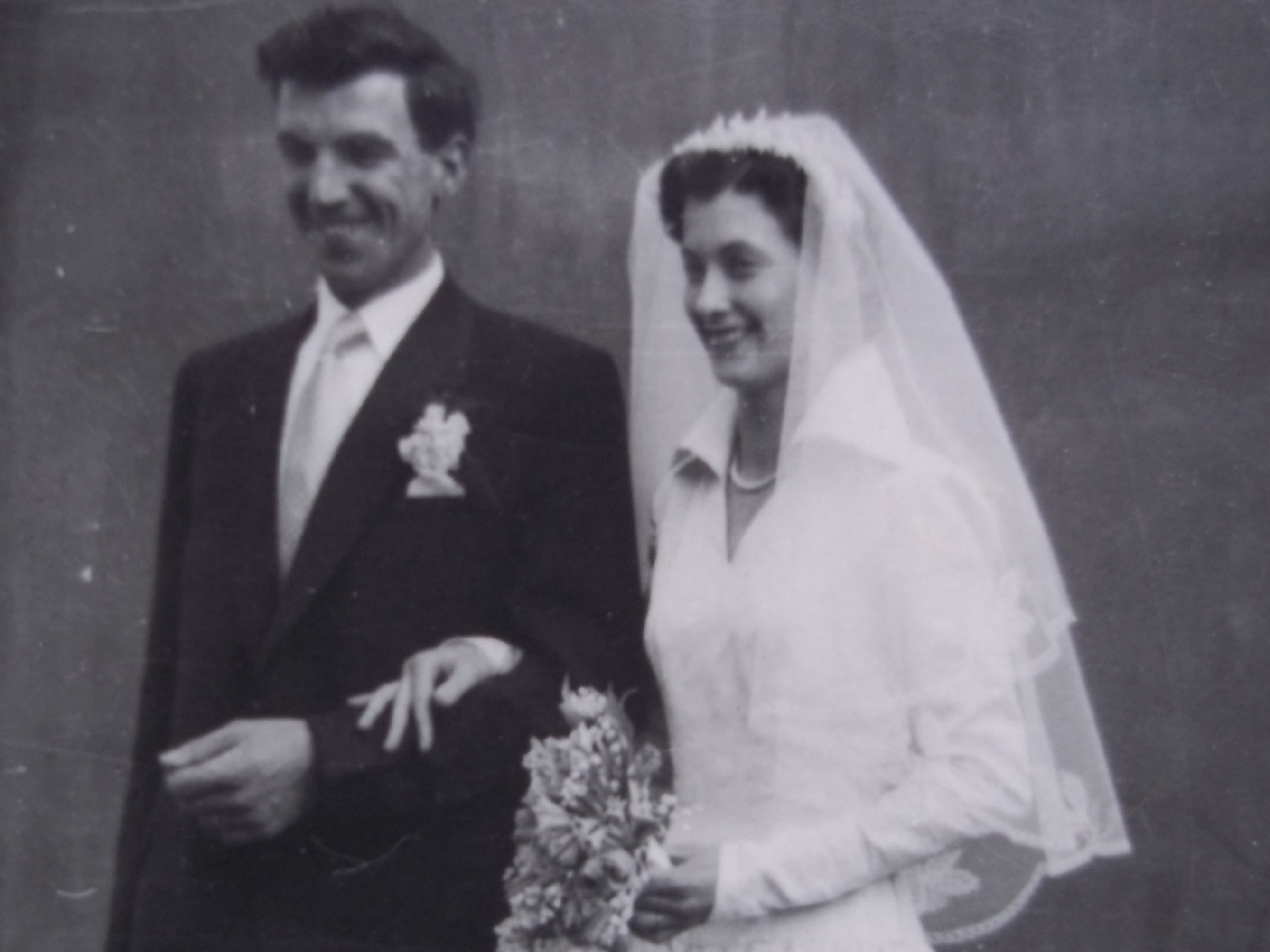 Irene thrived at Worcester. Her salary of £30 per month enabled a single girl to live well and to save for the future. She became great friends with all the girls who worked for her, including Miss O’Connell, Miss Thatcher, and Worcester branch’s cleaning lady Mrs Turbeville. This lovely shot of the staff in their shop was taken for the Dorothy Perkins company magazine. The young photographer who took the picture returned to the shop several times, for what he insisted were vital retakes. He had, Irene remembers with amusement, “The biggest ears you ever did see.” Eventually, he plucked up courage to ask Irene to go out with him. But an evening at the Wolverhampton Grand Theatre, and afternoon tea with his parents in their Worcester flat were insufficient to impress. On New Year’s Eve 1954, Irene was to meet her future husband, at the exclusive staff ball held at the Powick Asylum. As midnight chimed, a net of balloons was released from the splendid ceiling of the Victorian ballroom. Irene watched a girl sip from a glass of port as she sternly warned a defiantly grinning young farmer in a sparkling white dress shirt to desist from popping the balloons with his lighted cigarette. He earned a big sticky red stain for the front of his shirt from that other girl’s glass of port wine. Despite that, Irene accepted a lift home on the back of Trevor Thackeray’s motorbike……………….and…..and