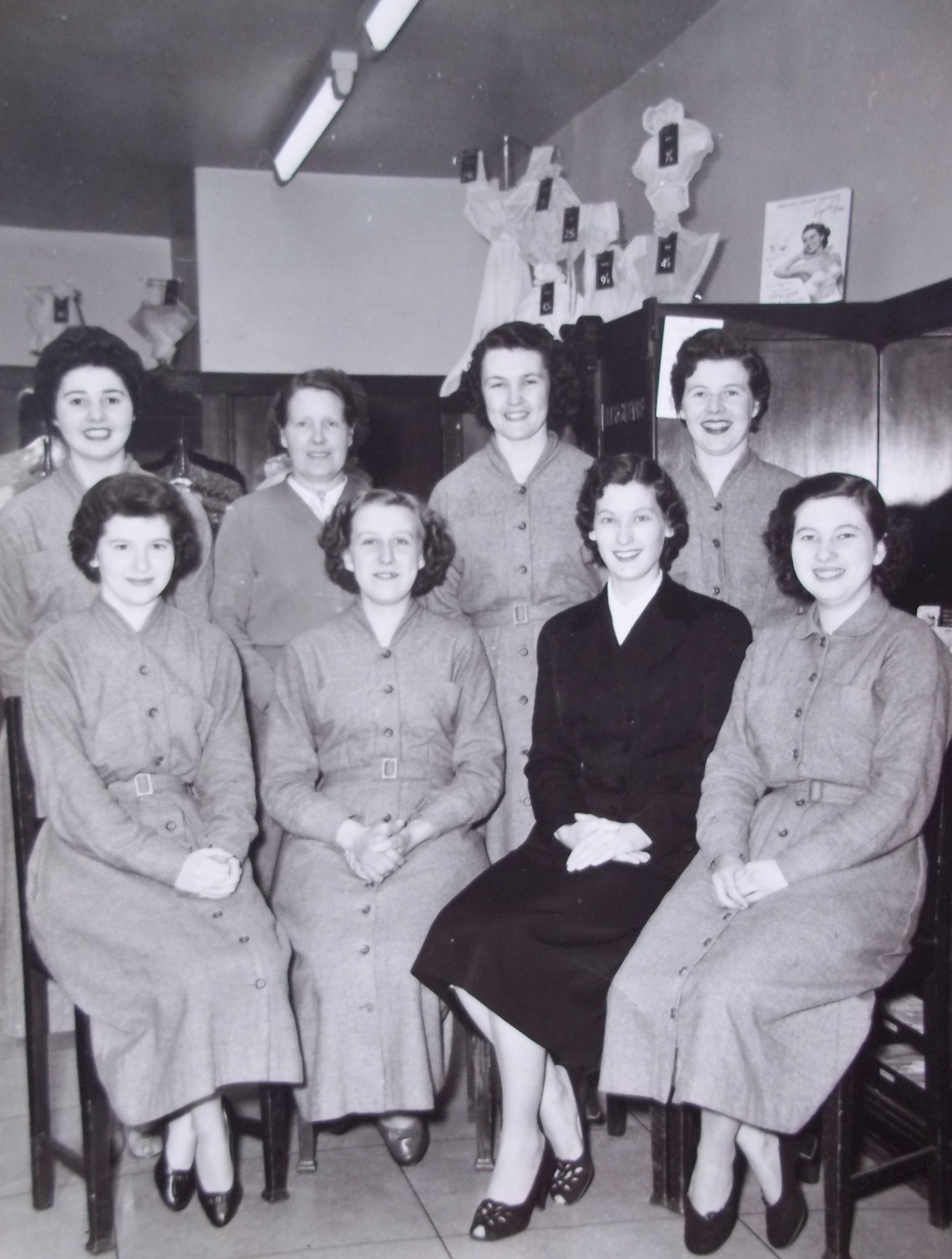 The staff of the Walsall branch of Dorothy Perkins in the early 1950s. A young Irene Sheldon, second row, left, has one hand on the shoulder of Mrs. Rathbone, the cleaner. Mrs. Brown, manageress, is at the front.