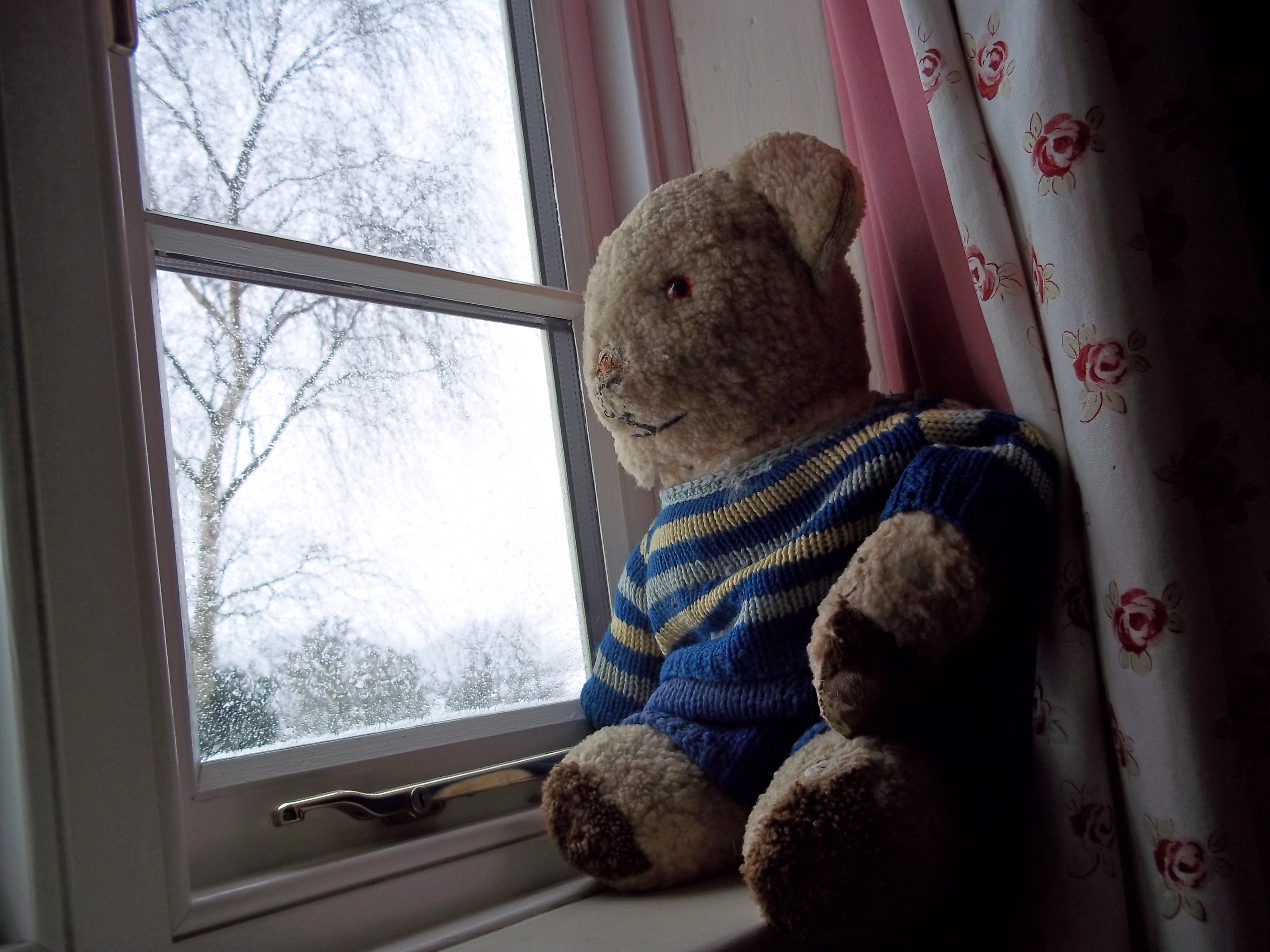In his threadbare (!) old age, Big Ted is now content to observe the wintry weather from the window. January 2013.