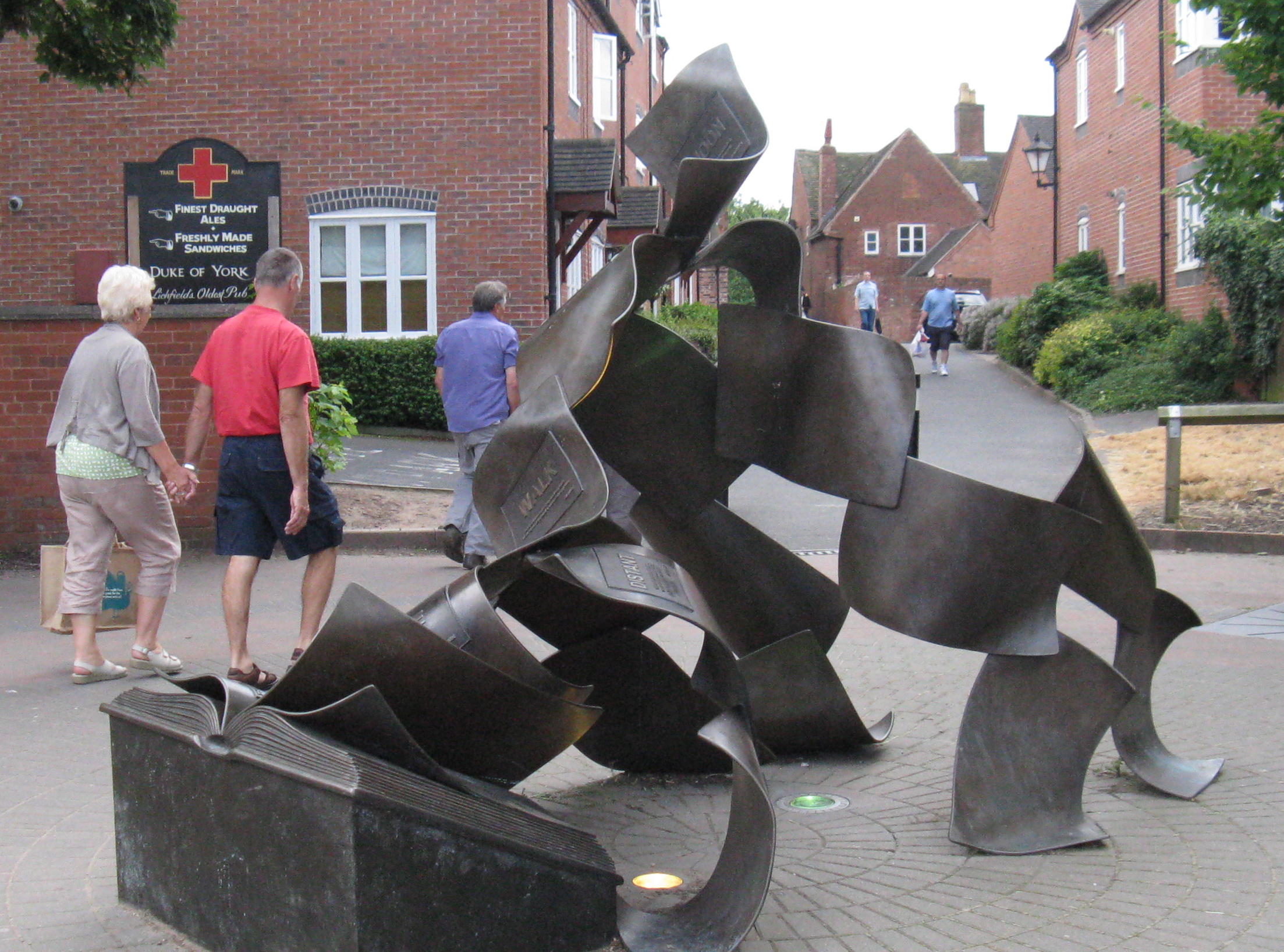 At the Tesco end of Greenhill Mews is “The Formation of Poetry,” by Lichfield born sculptor Peter Walker, which was unveiled in September 2010.  It is a dramatic tribute to the life and work of Samuel Johnson, in the form of an animated dictionary from which choice pages are cascading away. The title of the work refers to Johnson’s method of using poetical quotations to establish the meaning of words. These include “Sleep,” ; “Walk”; “Moon,” “Cloud,” and “Rose”, with supporting quotations from verse.  “Worro,” does not appear in the famous dictionary, although it is a word which must surely have been heard in the Lichfield of Johnson’s  youth. I have a hunch that it, like its upper class relative, “What Ho!”, can be traced back to the earliest of English poetical sources……..