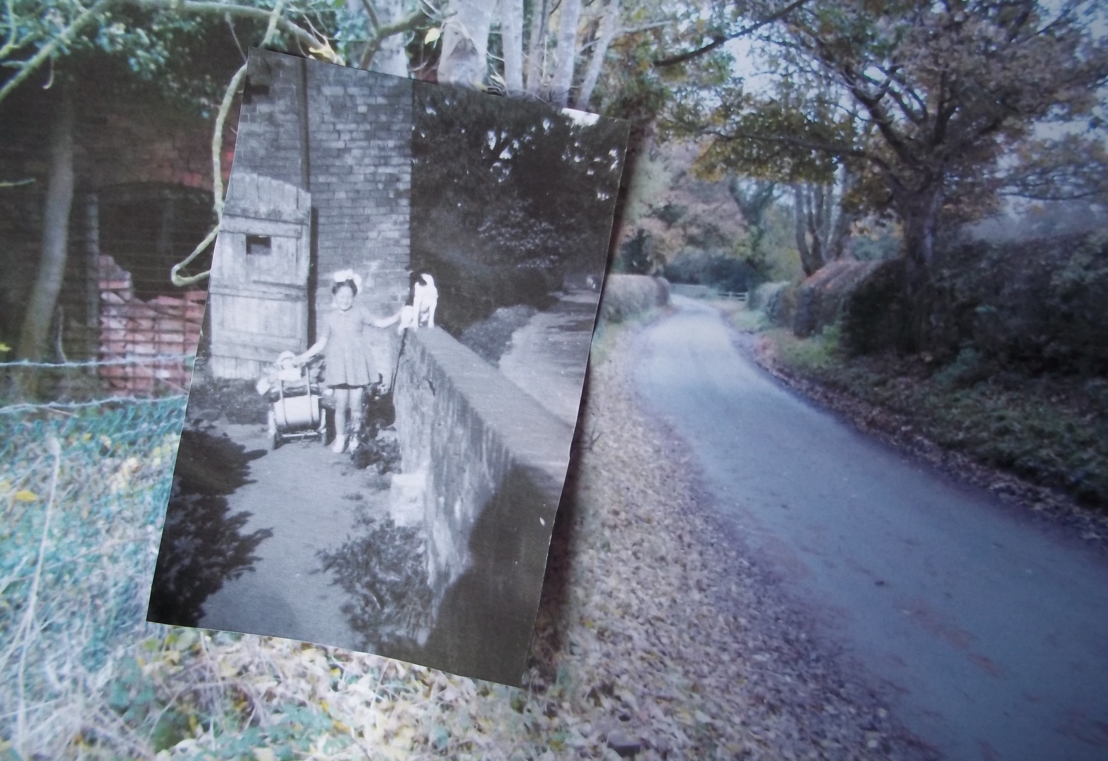 My inner eye has compiled a little flip-through book of images over the intervening, uninhabited, years of the little dwelling, its boundary wall, and its outbuildings, as they have sunk gradually, incrementally, to their rendered red brick knees onto the soft, loamy soil.  Windows are now bricked up and blind, and chimney pots long toppled. The field which comprised the small holding is overgrown. However, the wood and the stream by which it is bounded look much the same, and the precise curve of the lane down to the bridge over Footherly Brook is unchanged from the sunny August day in 1950 when my Dad took a snap of his niece, Josephine Anne, her refined, well dressed dolly, and Bob the dog.