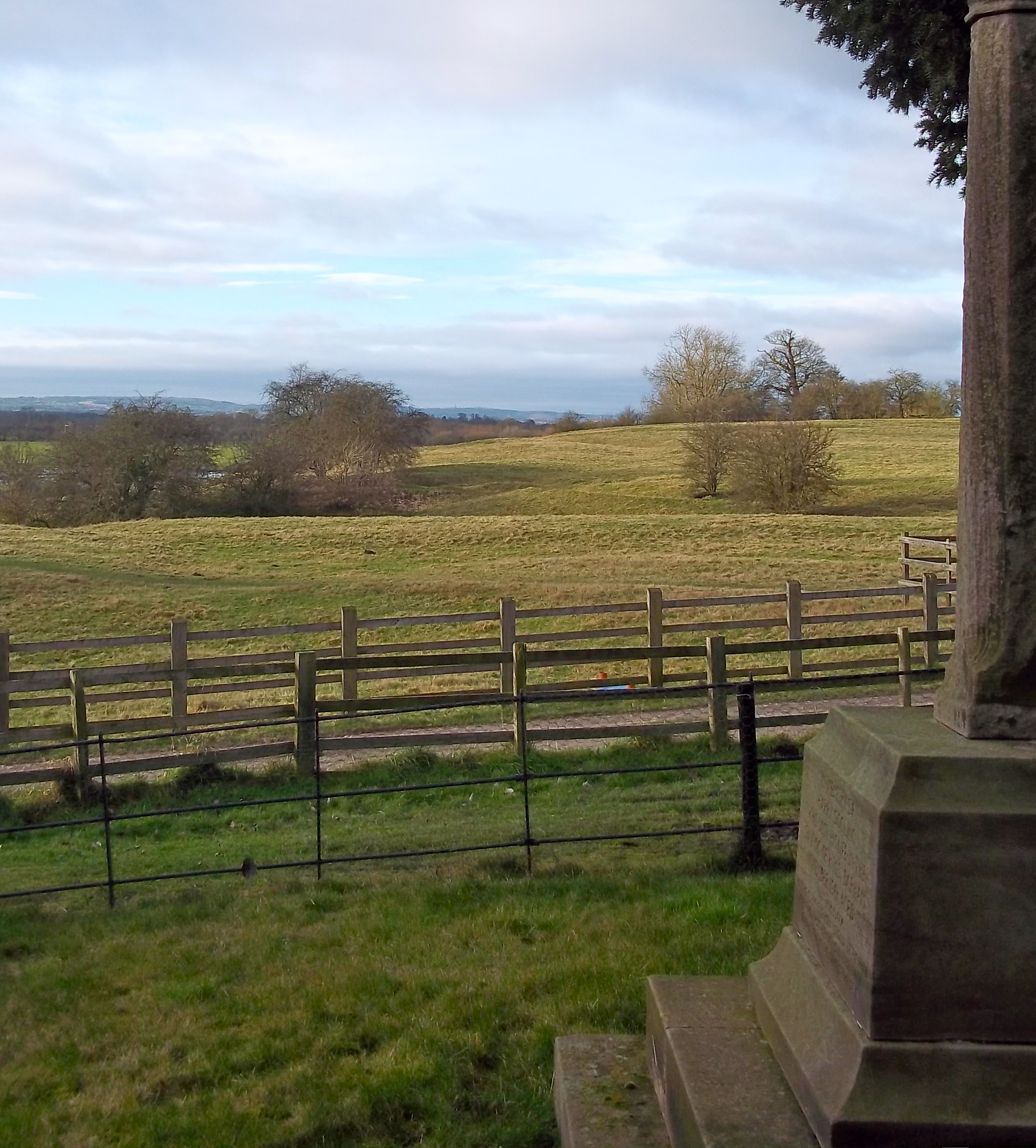 From the War Memorial in Wychnor Churchyard, over the undulations marking the site of earlier settlement, the next high ground over the valley of the River Trent is Cannock Chase. January 2013.