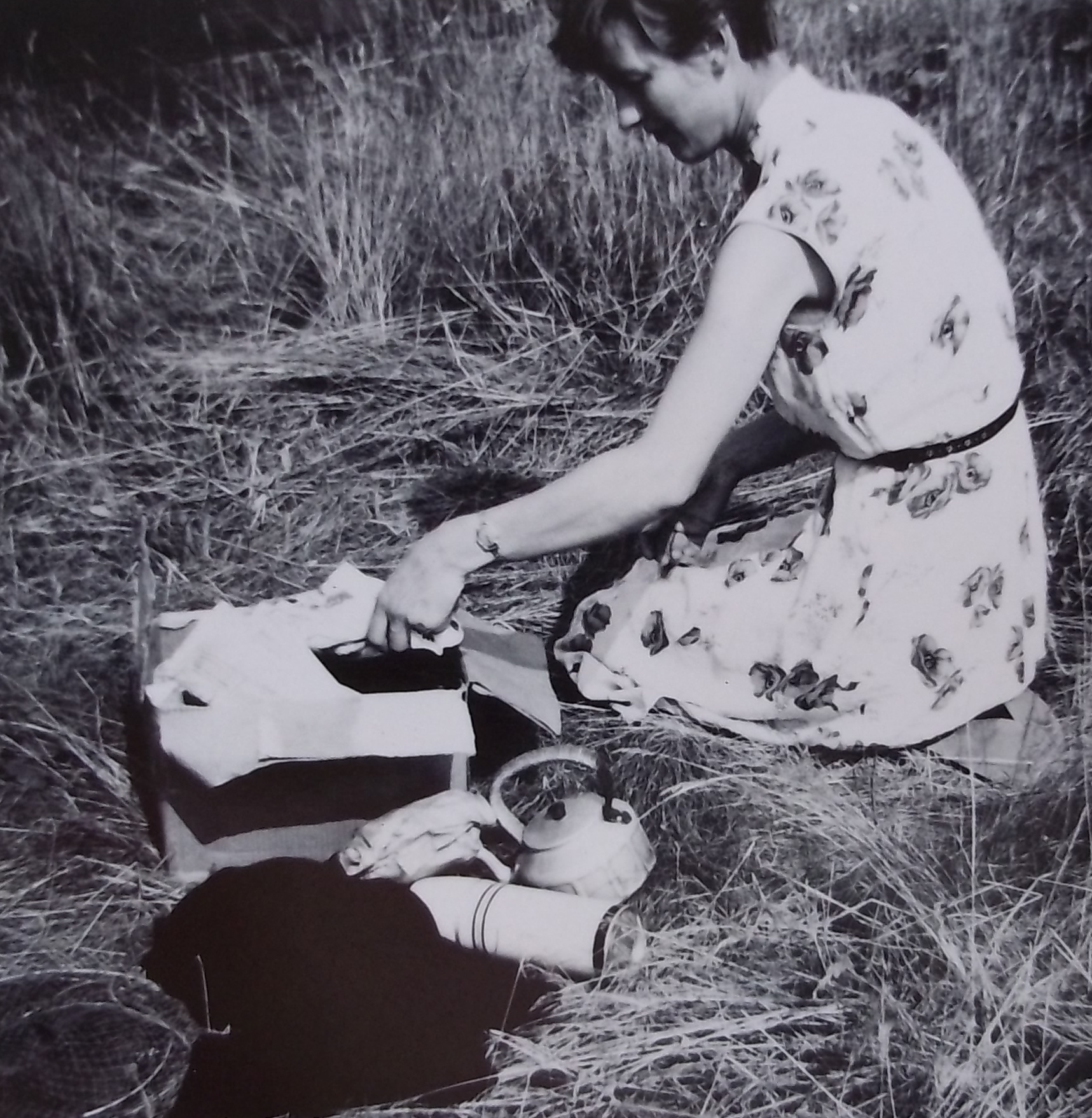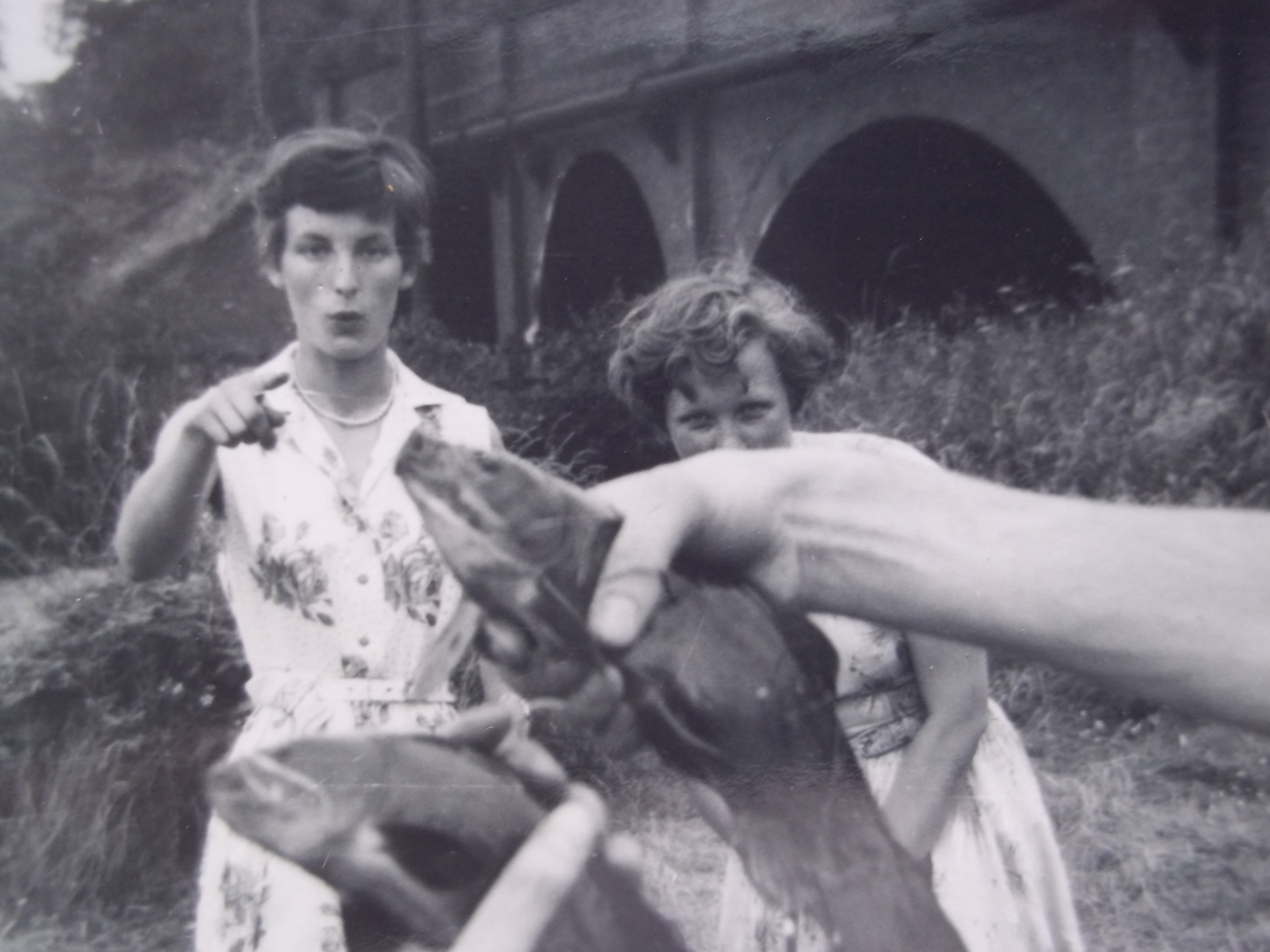 1955.  Here’s Mother, in the dry and sunny summer of that year, unpacking the makings of tea and bacon sandwiches at the usual spot.  She is kneeling in the long dry grass, in a demure, poppy strewn print frock, near a now late, lamented and uncharacteristically straight stretch of the “curly” Wyrley and Essington Canal, behind South Staffordshire Water Company’s  Pipe Hill Pumping Station, just west of Lichfield. The previous year, 1954, this stretch of the Wyrley and Essington  between Ogley and Huddlesford had been closed to canal traffic.  The lack of disturbance in its reedy, weedy depths can only have been good news for  keen sportsmen like my dad. Respectable catches were occasionally documented on these week end fishing trips. Here are Mom and her friend, Betty, contriving to look astonished by a piscatorial haul, in front of the bridge carrying the Walsall Road over the canal at Pipe Hill.  The optical illusion which my dad seems to have been aiming for is somewhat spoiled by the presence of Ron’s “giant” hands in the picture.