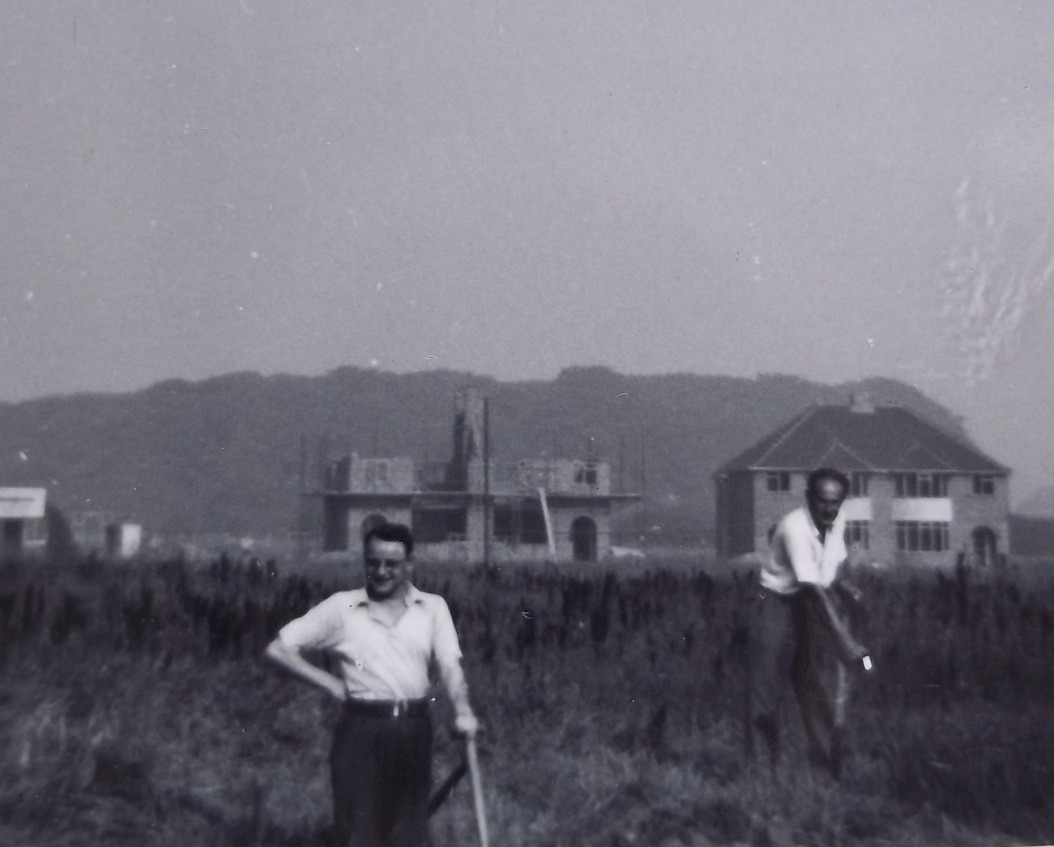 My father, Ted Horton, (right) measures up the plot for 155, Bosty Lane.