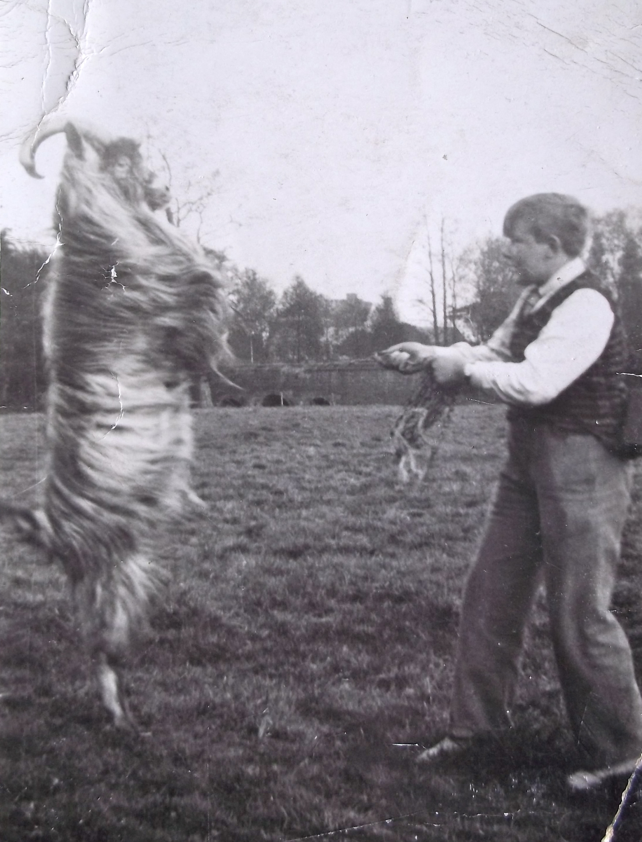 My dad at about the time he was leaving Shenstone school in 1939, with the obstreperous goat, Billy. In the field at Keepers Cottage, Footherley, with the bridge over the Footherley brook in the background.