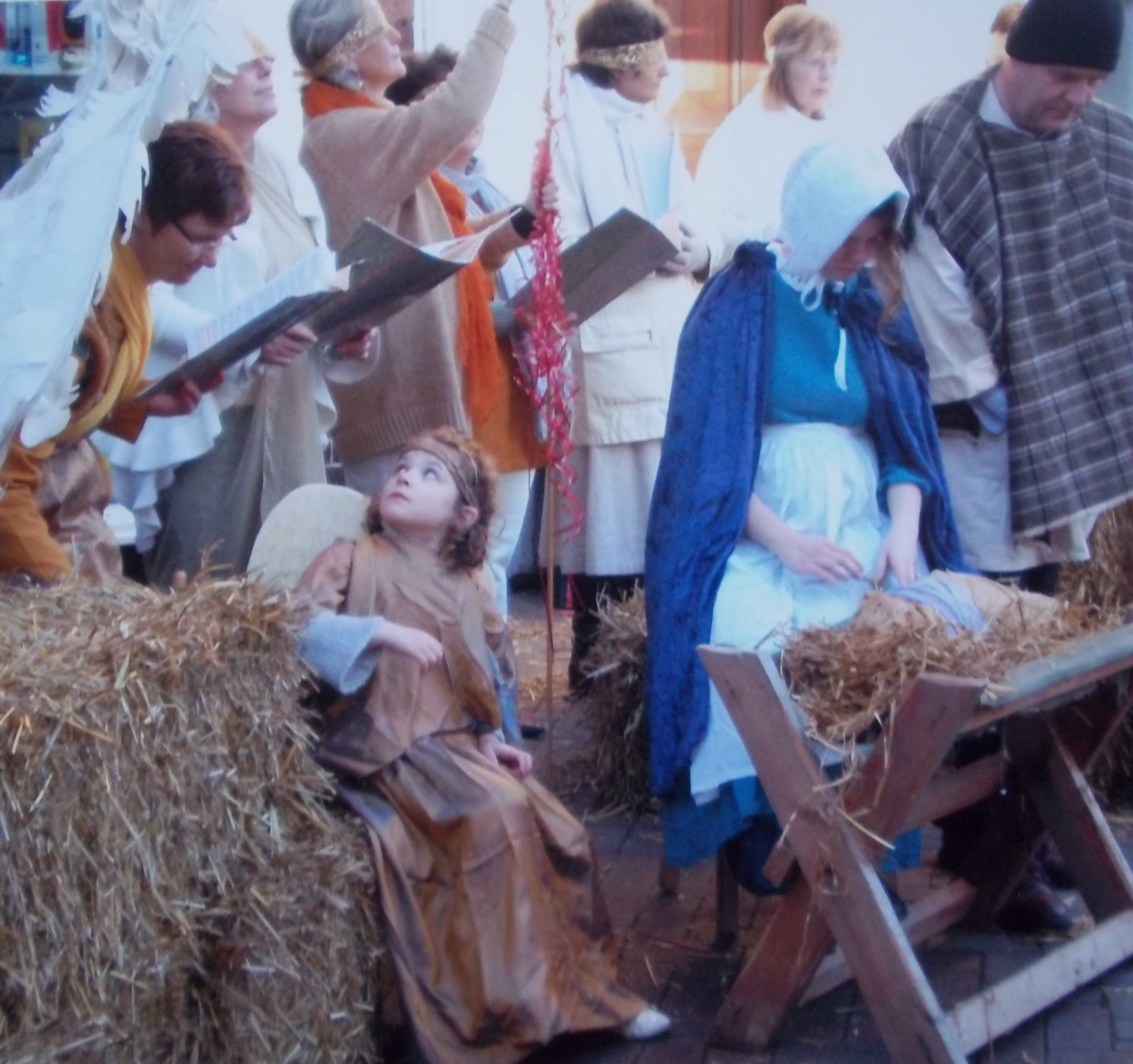 A Mystery Play about the Nativity – being perfomed in Lichfield in December 2009. It is authentic that the costumes are reminiscent of British working clothes of yesteryear.