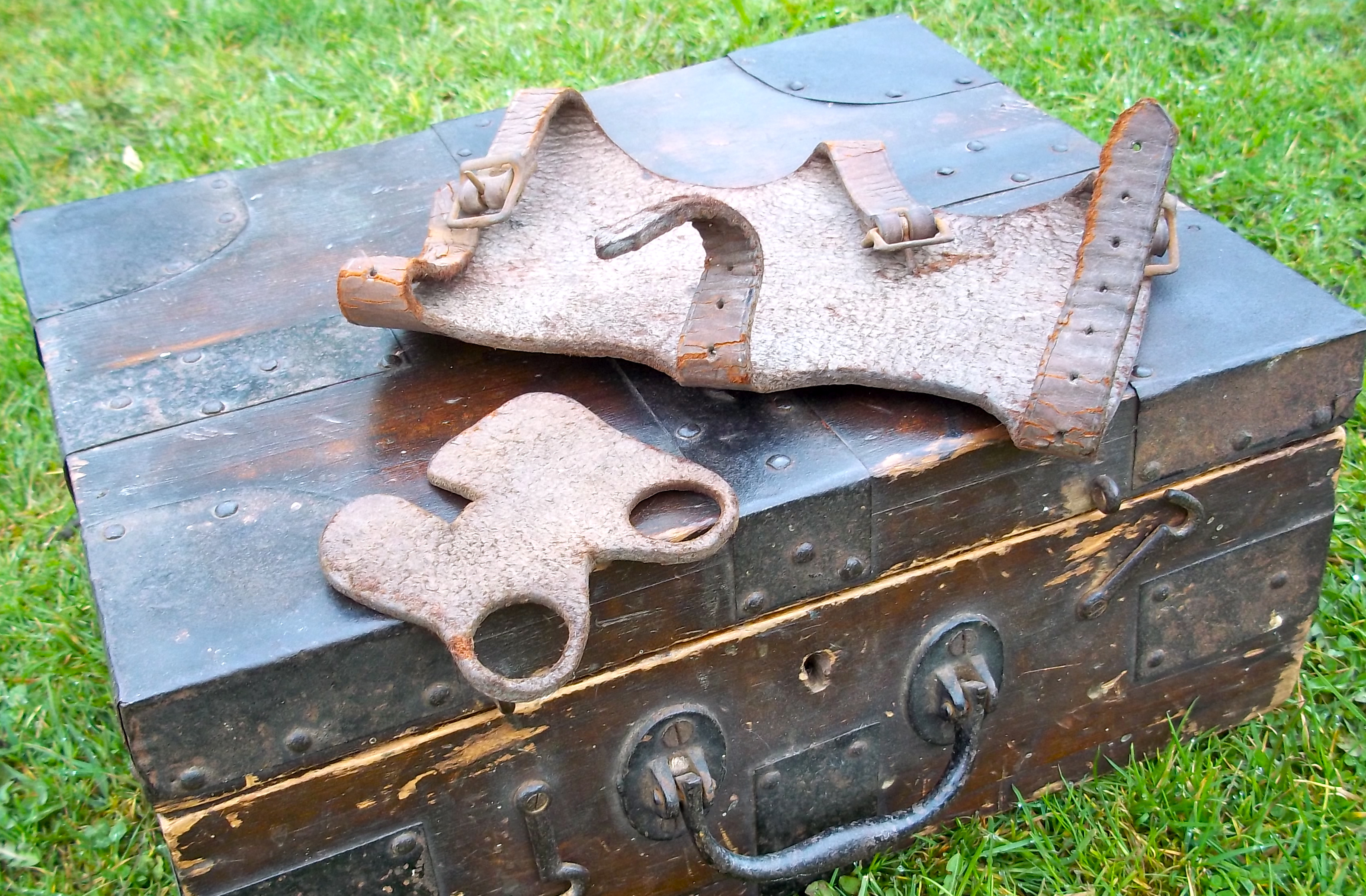 100_7892These snuff-brown pieces of thick, stiff, dry, hide have the passing appearance of relics from a medieval fortress siege.  They are my dad’s “tab” (finger-guard) and “bracer” (arm-guard), from his practice of archery , which my parents had taken up some time early in the 1950’s.