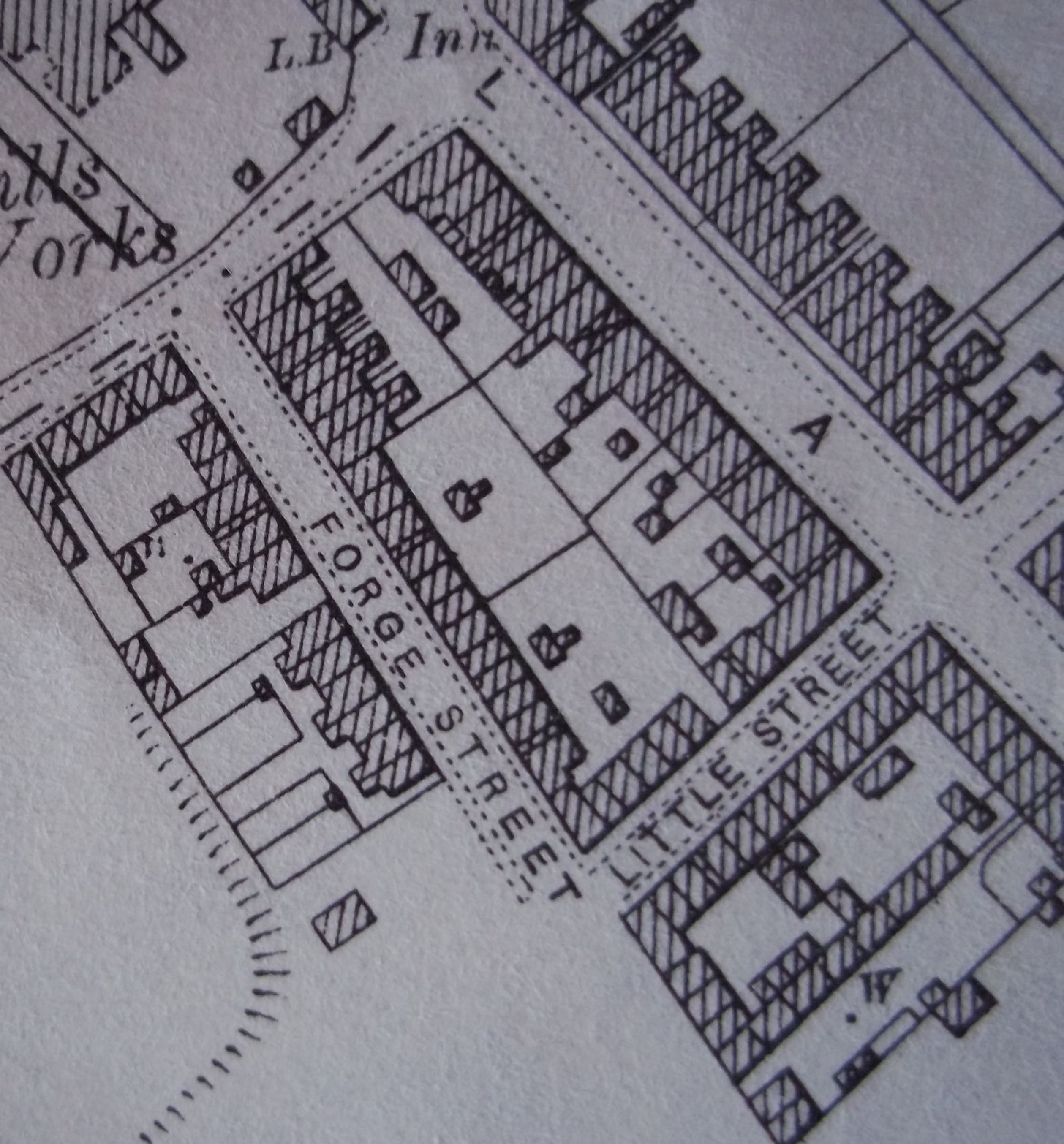 From the 1902 Ordnance Survey Map, Forge Street and Little Street in Birchills. My great-aunt, Maud Ford, nee Day, lived in one of the middle group of houses on the east side of Forge Street. The building housing shared privies and brewhouse is in the communal yard.
