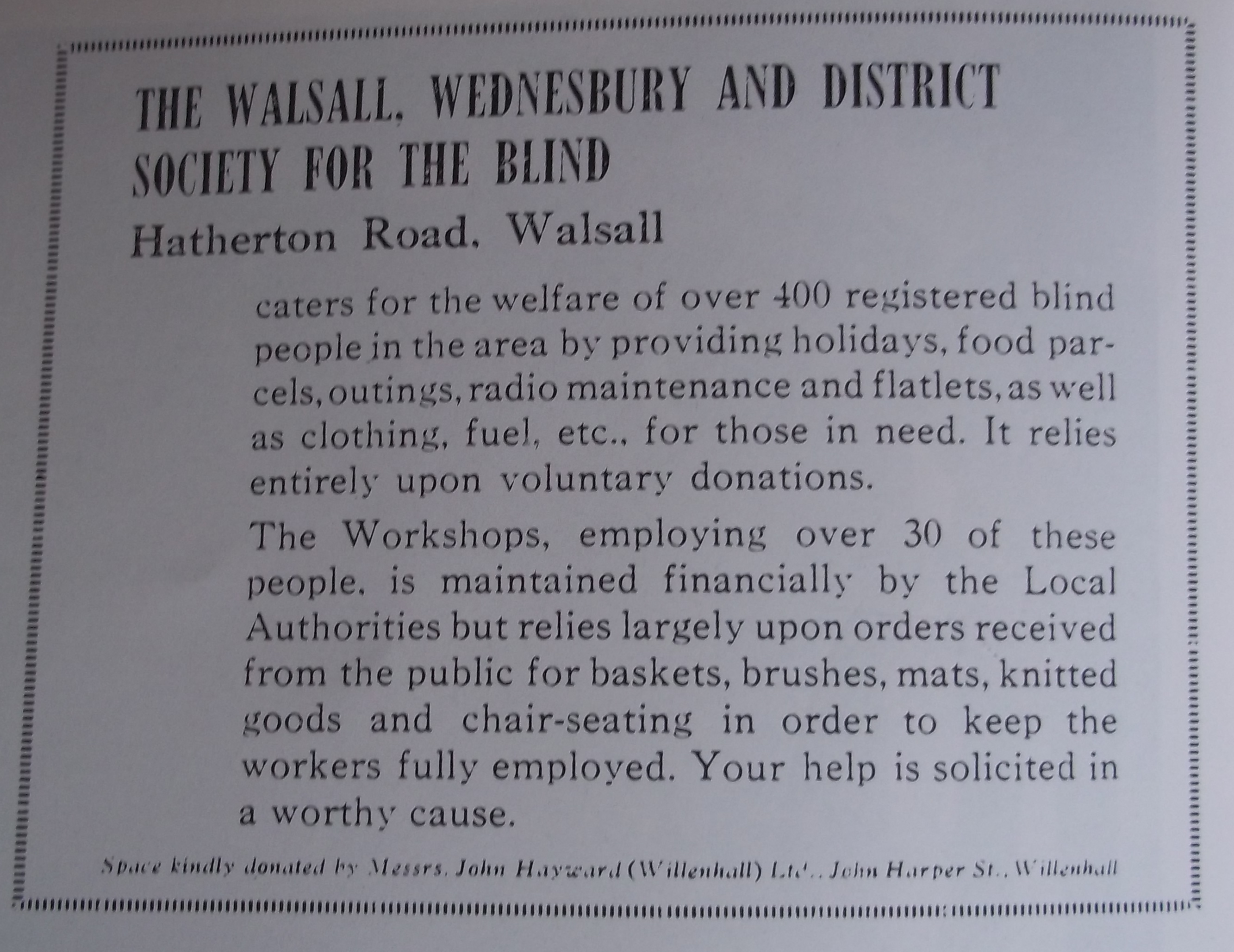 A 1950s advertisement for the Walsall, Wednesbury and District Society for the Blind. Reproduced in “Memories of Walsall ” by Alton Douglas and Dennis Moore.