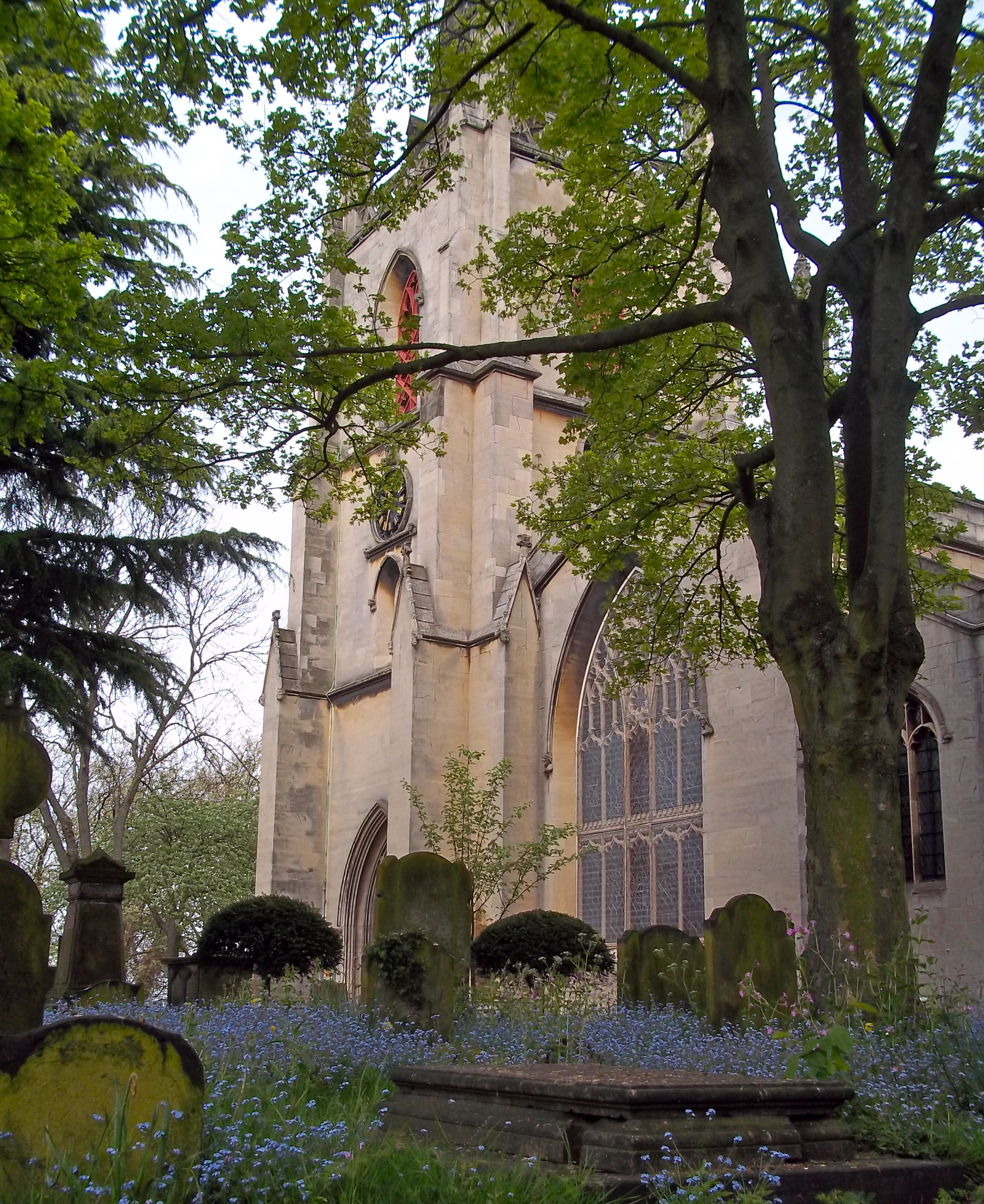 St Matthew’s, Walsall, a parish church with Norman origins. In April its Victorian tombstones are interleaved with Myosotis, or “Forget Me Not”