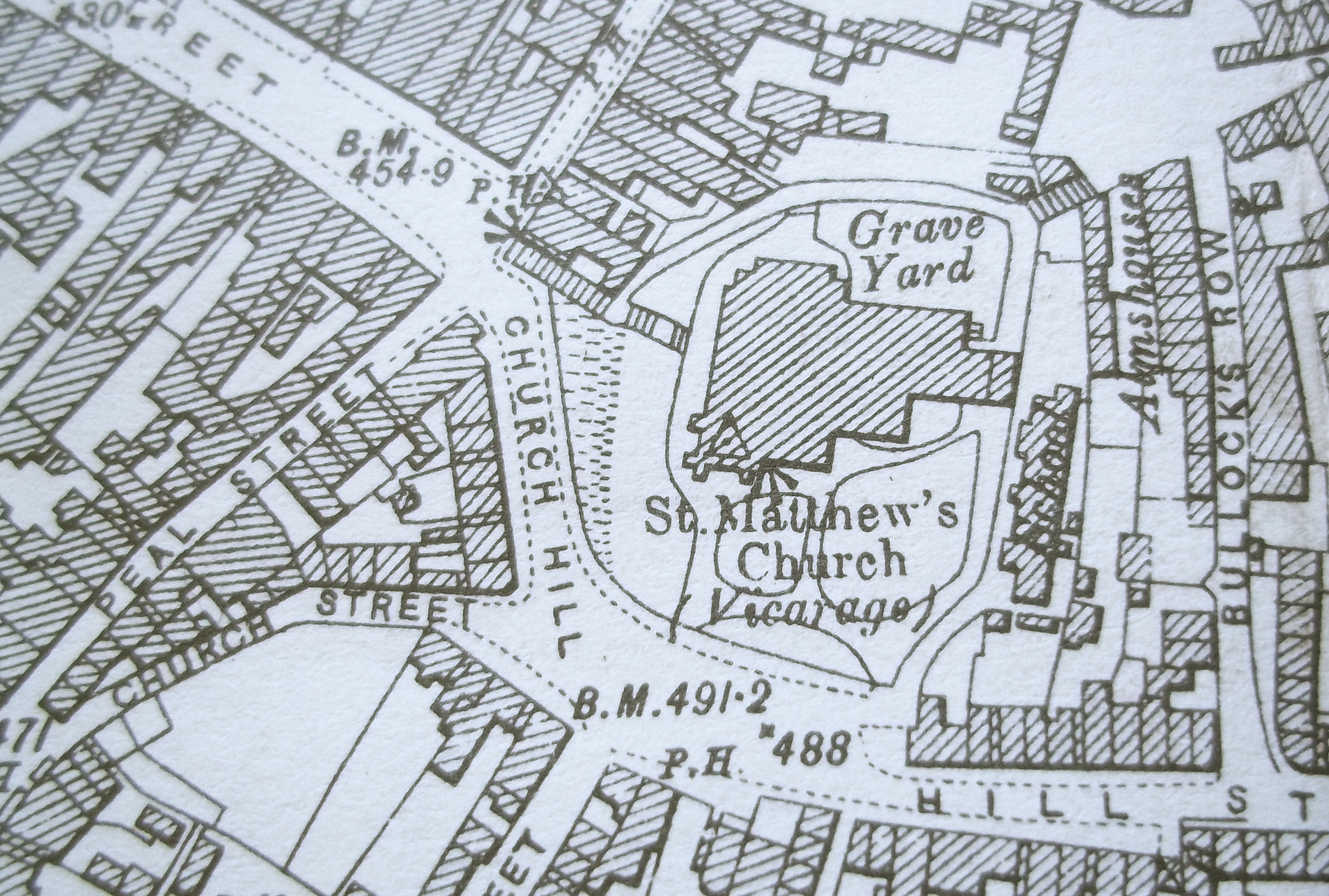 St Matthew’s church and environs from the 1901 Ordnance Survey map, following partial slum clearance, that would be completed only after the Second World War