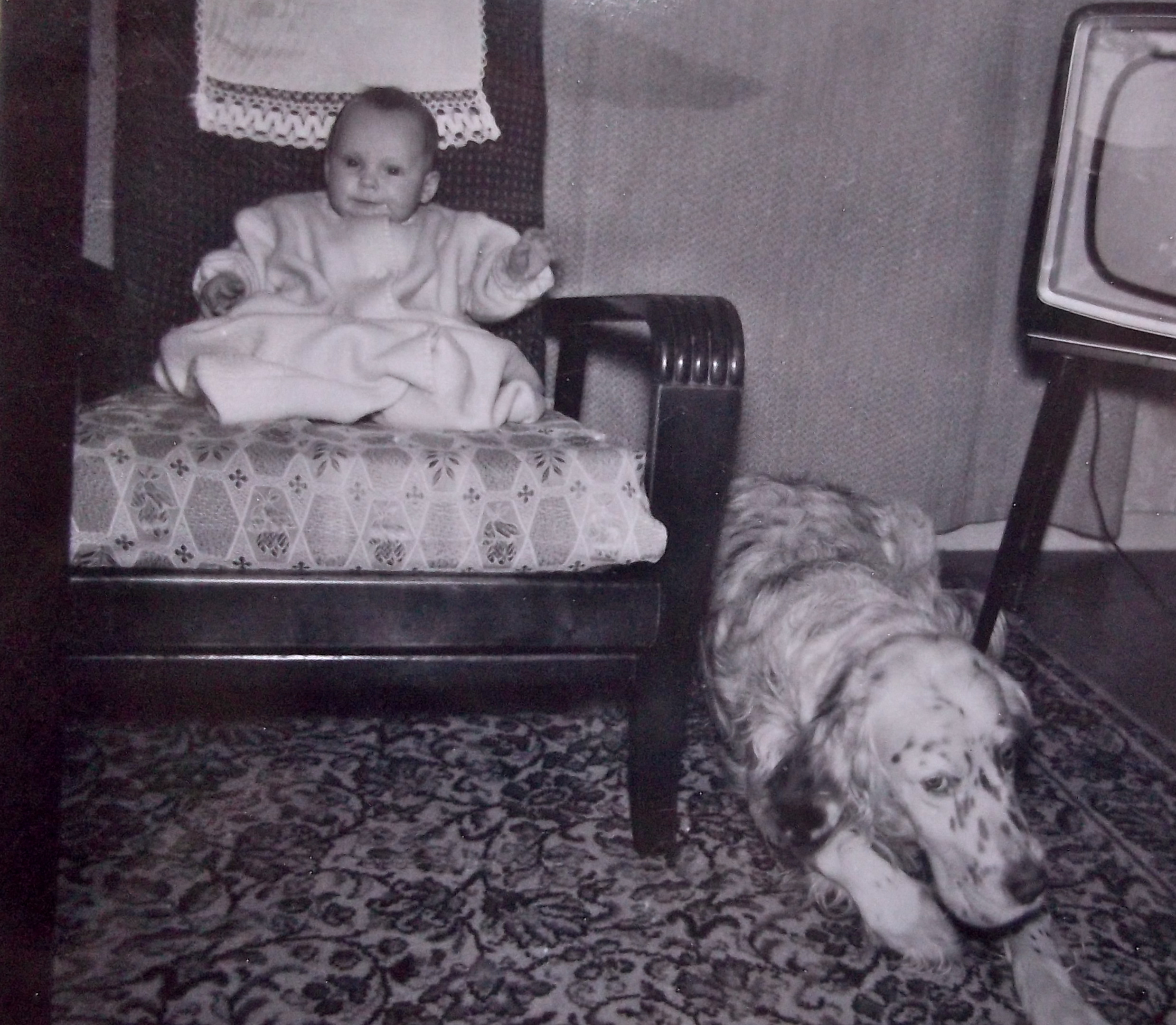 Mother and I spent the following – then requisite – several days of complete rest both happily be-pillowed between the dark polished oak headboard and footboard of my parents’ bed at Bosty Lane. Aunty Rene kindly double-bussed it from Stonnall to make light of the housework, and a community midwife attended to us. Mrs Gombridge was that right-thinking professional who seems to have esteemed dogs at least as highly as she did babies. Two large mongrels accompanied her on her rounds, panting and wagging their tails in her little car as she made her calls on new mothers, and her dark uniform was liberally coated with their hair. She put paid to any misgivings my mother had about big dogs and new babies and briskly insisted that Simon should be introduced to his new human immediately. His kind brown eyes watched protectively over me for the next several years. With angelic patience, he suffered my little arms to probe deep into his soft liver-and-pink mouth to retrieve an important piece of Lego that he might have purloined from my play.