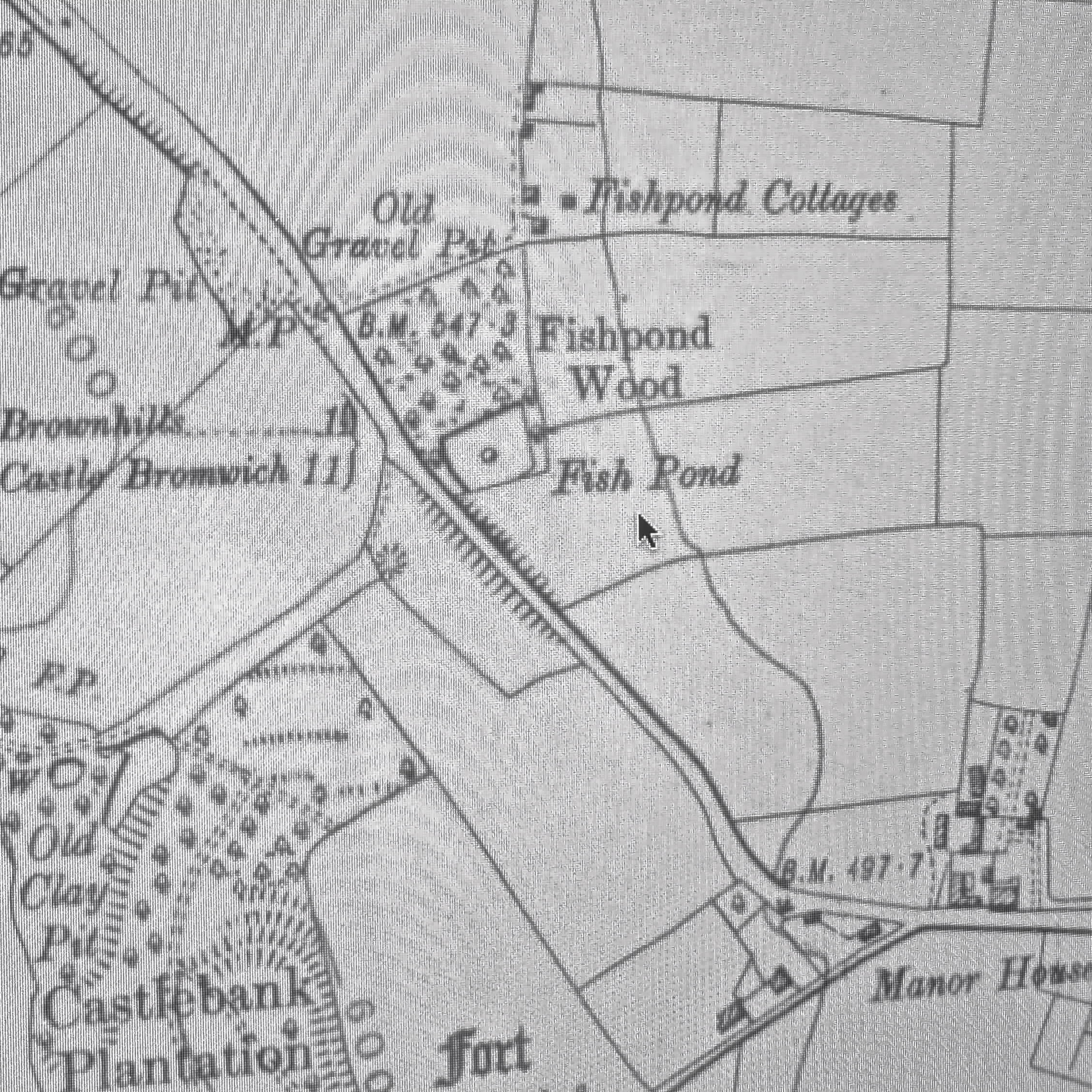 Fishponds was a strange place to live, when you think about it: Isolated, unconnected to the nearby settlements of Stonnall or Walsall Wood, which were, even so, so near; hemmed in by trees and the adjacent excavations. I don’t see the cottages mentioned by name earlier than the turn of the 20th century. Could they have been constructed for workers at the quarry?  If so, how come my grandfather and his family ( then coal miners), and his cousin, Gertrude’s father, John ( a bricklayer) lived in them? And what of the Fish Pond itself? Clearly marked on maps contemporary with my family’s occupation, just how old was it, and why was it significant enough to give its name to the wood, and the cottages?  Was it, as it appears to me, man made? What was its connection with the Iron Age Hillfort of “Castle Hill,” looming on the other side of the Chester Road?