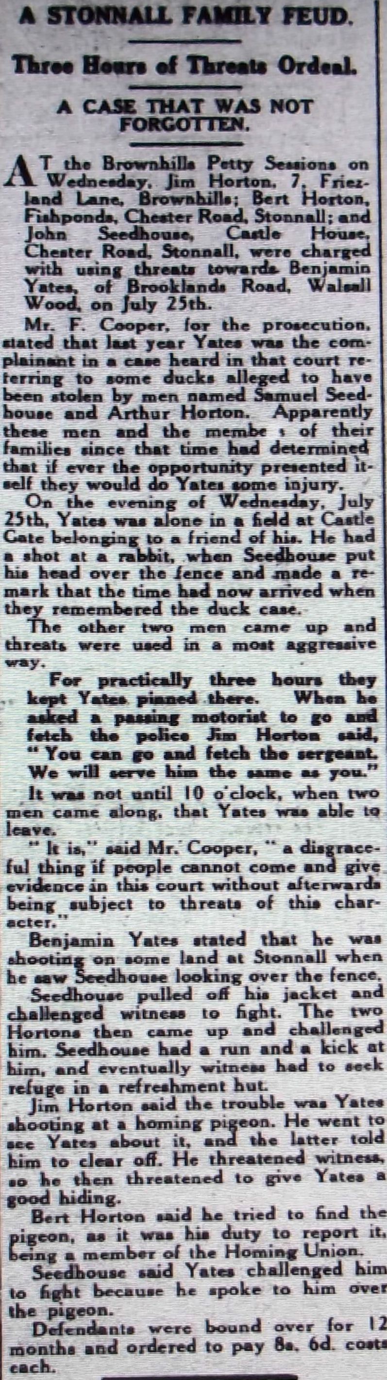 By the 1960s, only Uncle Jack and Aunt Gertrude remained at Fishponds, and our association with it ended soon afterwards, when the required work on the cottage was completed. Their parents were long dead, of course, and I don’t know when Gertrude’s remaining siblings had drifted away. Records show that her pigeon fancying brother Bert seems still to have been knocking about at Fishponds according to an account of a hearing at the Brownhills Petty Sessions in August 1934: A fauna-based fracas involving a rabbit, a pigeon and a duck resulted in a telling off from Mr Cooper, the prosecutor, and payment of costs, with the pugnacious Horton brothers and their associate John Seedhouse bound over to keep the peace.