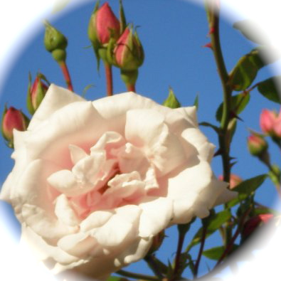 Rosa “The New Dawn” flowering freely from the pergola at Keeper’s Cottage, Orgreave, on a fantastically sunny day.