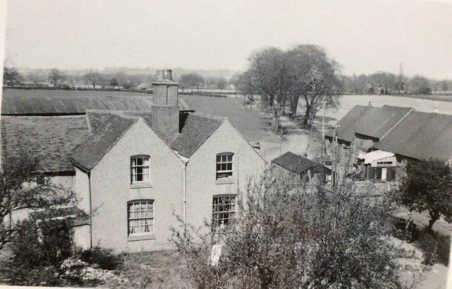 From the lofty height of the Lucas free-light pylon, a view of The Owletts, and its tree lined drive leading down to Lynn Lane, Shenstone. 1952.