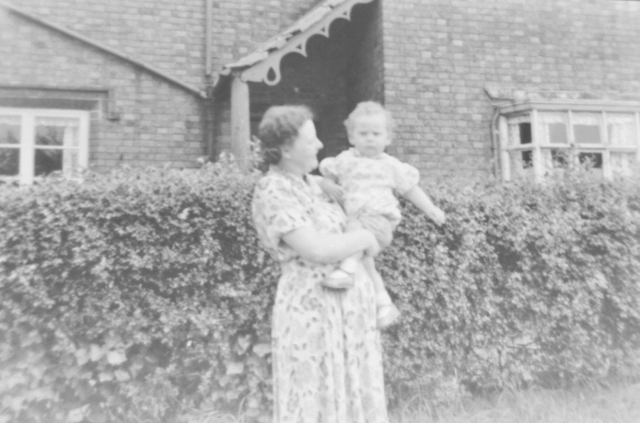 Aunt Rene dandles my infant cousin David outside her home, Church Cottage, Thornes, Stonnall, Spring 1952.